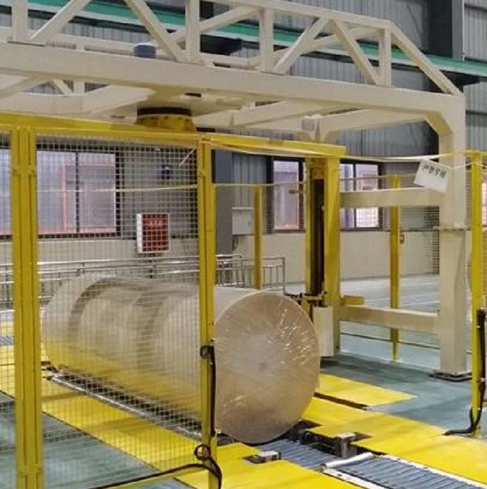 Envoltura elástica de carrete con brazo giratorio. La máquina envuelve el rollo de papel radial o completamente para diferentes propósitos de almacenamiento. La envoltura elástica del carrete envuelve la película estirable en un rollo de papel para formar una buena protección durante el transporte o el almacenamiento.
